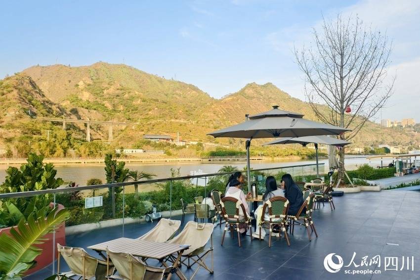 距离水电站十余公里处,攀枝花市东区银江湖公园碧水如镜,依托湖区打造的生态公园里童声琅琅,湖畔咖啡店中,游客悠闲地品尝下午茶,远眺湖光山色。