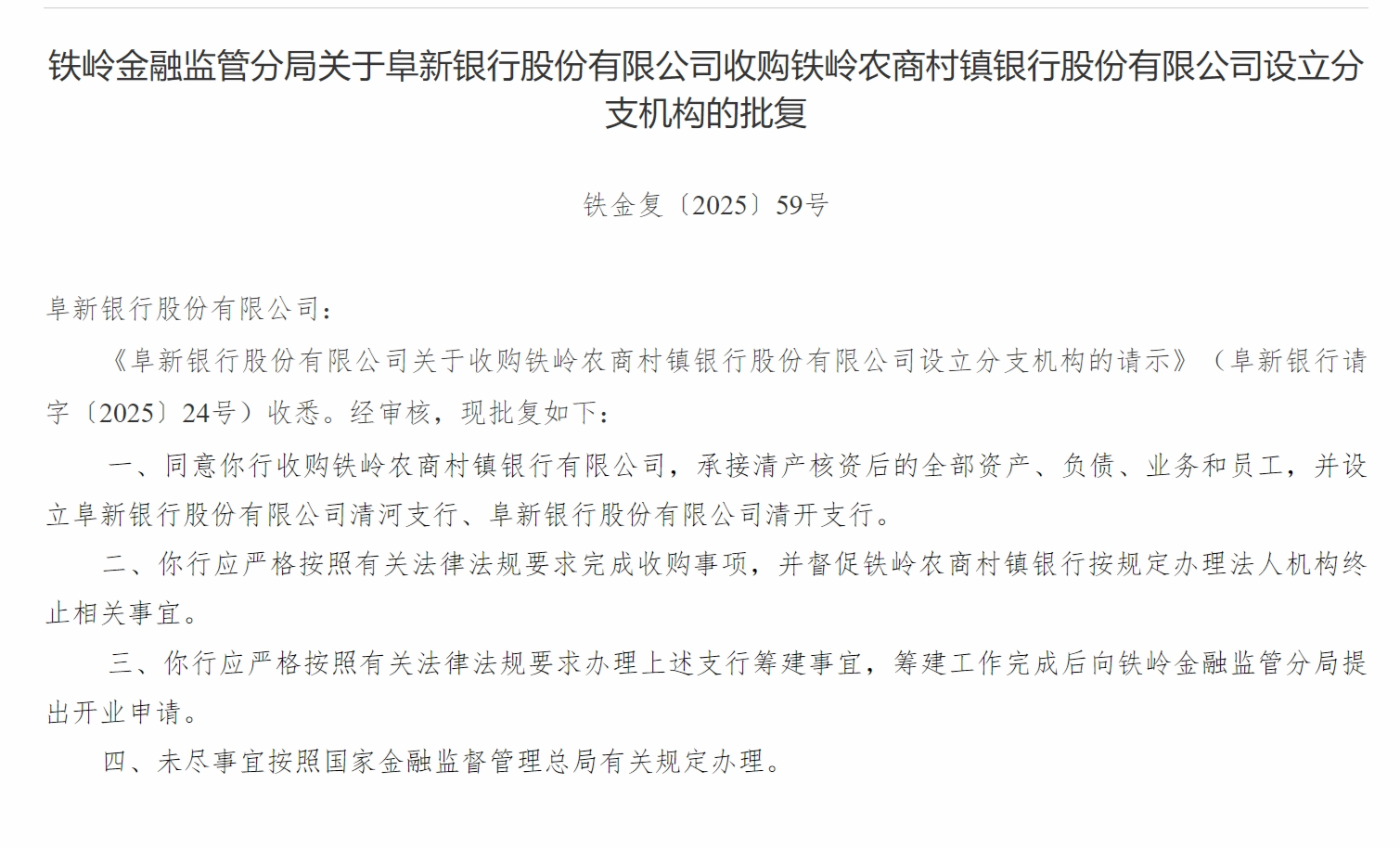 12月9日,铁岭金融监管分局发布关于阜新银行股份有限公司收购铁岭农商村镇银行股份有限公司设立分支机构的批复,同意该行收购铁岭农商村镇银行有限公司,承接清产核资后的全部资产、负债、业务和员工,并设立阜新银行股份有限公司清河支行、阜新银行股份有限公司清开支行。