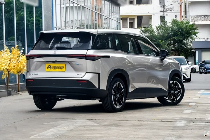 车身侧面是铂智3X比较耐看的角度之一。整体比例协调,没有因为追求空间而显得臃肿,三段式腰线让侧面层次感更加分明,配合略微上扬的窗线设计,让整车多了几分动感。隐藏式门把手在同级纯电SUV中已经算是常规配置,不仅提升了整车的科技感,同时也有助于降低风阻,对续航表现带来一定正向帮助。轮圈方面,铂智3X配备了19英寸双色铝合金轮圈,尺寸和造型都比较到位,视觉效果有存在感,但又不会为了好看牺牲太多舒适性,依然符合家用定位。
