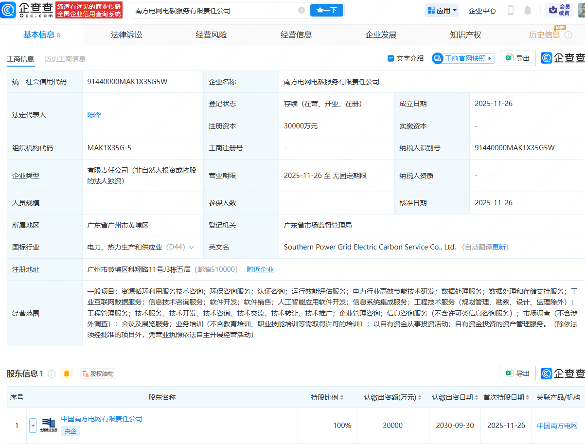 近日,南方电网电碳服务有限责任公司成立,法定代表人为陈晔,注册资本为3亿元,经营范围包含:资源循环利用服务技术咨询;环保咨询服务;数据处理服务;人工智能应用软件开发等。企查查股权穿透显示,该公司由中国南方电网有限责任公司全资持股。